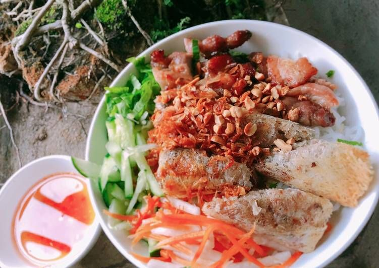 - Thêm thịt nướng vàng óng, rưới nước mắm chua ngọt đều tay.